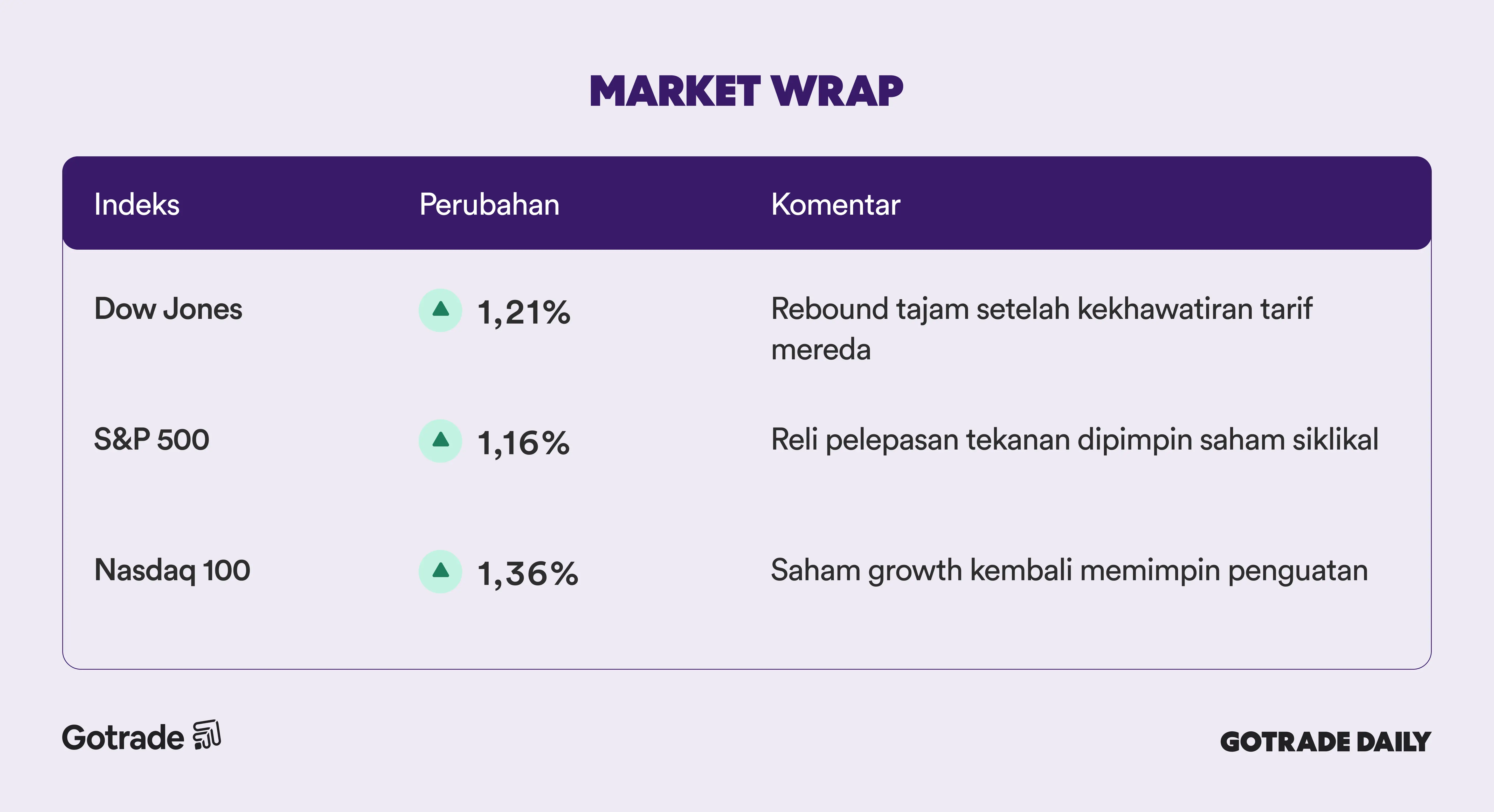 Indeks Dow Jones Industrial Average melonjak 1,21%, S&P 500 naik 1,16%, dan Nasdaq 100 menguat 1,36%. Meski demikian, ketiga indeks utama masih berada di zona merah secara mingguan, mencerminkan volatilitas tinggi dan rapuhnya sentimen dalam beberapa hari terakhir.