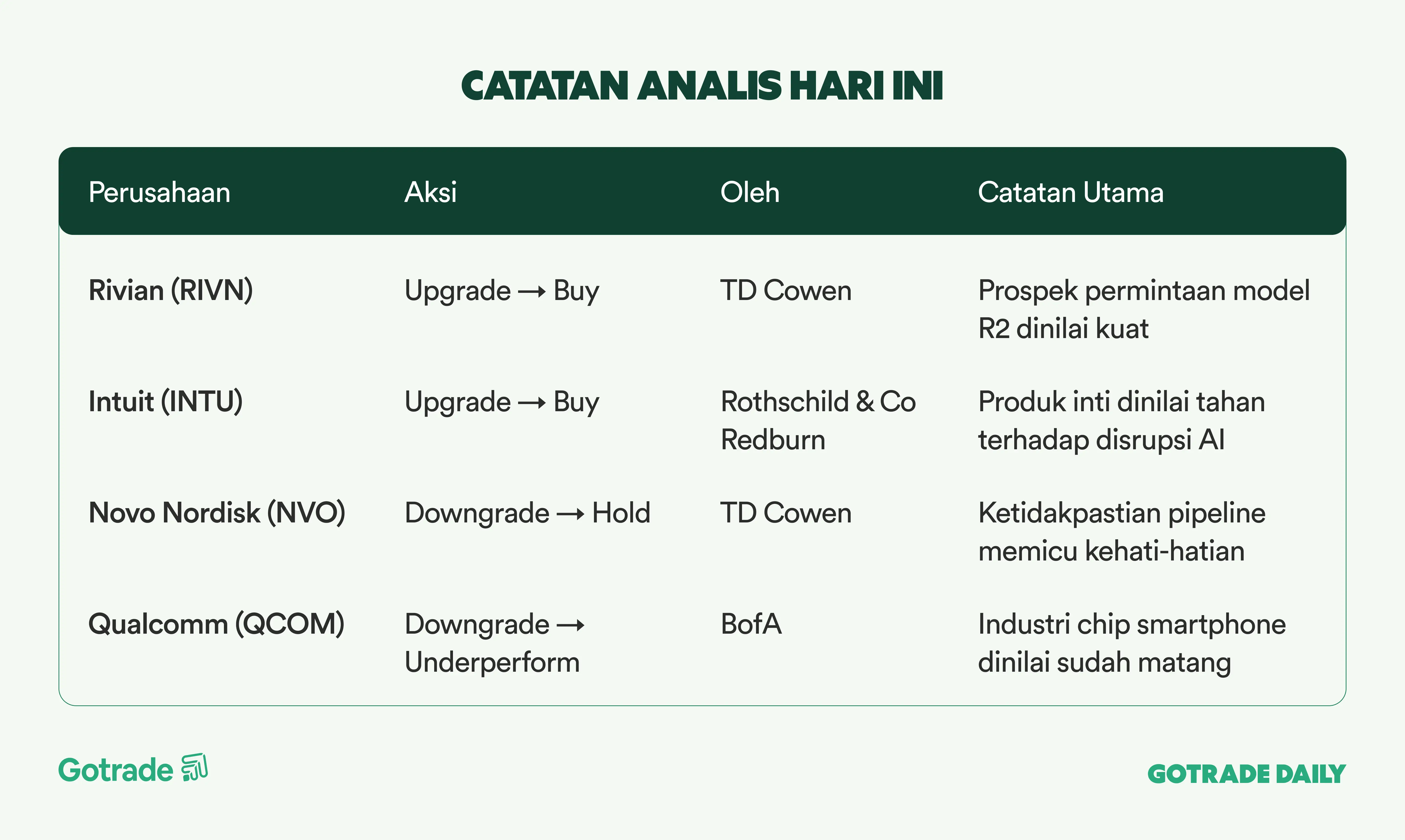 Saham Rivian Automotive (RIVN) naik sekitar 8% setelah TD Cowen menaikkan rating saham tersebut menjadi Buy dari sebelumnya Hold, didorong oleh proyeksi permintaan yang kuat untuk SUV menengah R2 yang akan diperkenalkan di SXSW Austin. Analis memperkirakan permintaan tahunan di AS untuk model tersebut dapat mencapai 212.000 hingga 335.000 unit, lebih tinggi dari estimasi konsensus pasar, dengan harga yang diperkirakan kompetitif terhadap Tesla (TSLA) Model Y, Hyundai Ioniq 5, dan Ford (F) Mustang Mach-E. Proyeksi tersebut dinilai dapat memperkecil kerugian EBITDA Rivian pada 2027 dan meningkatkan valuasi jangka panjang perusahaan, sementara target harga saham juga dinaikkan 18% menjadi $20 yang mengindikasikan potensi kenaikan sekitar 26% dari harga penutupan sebelumnya.