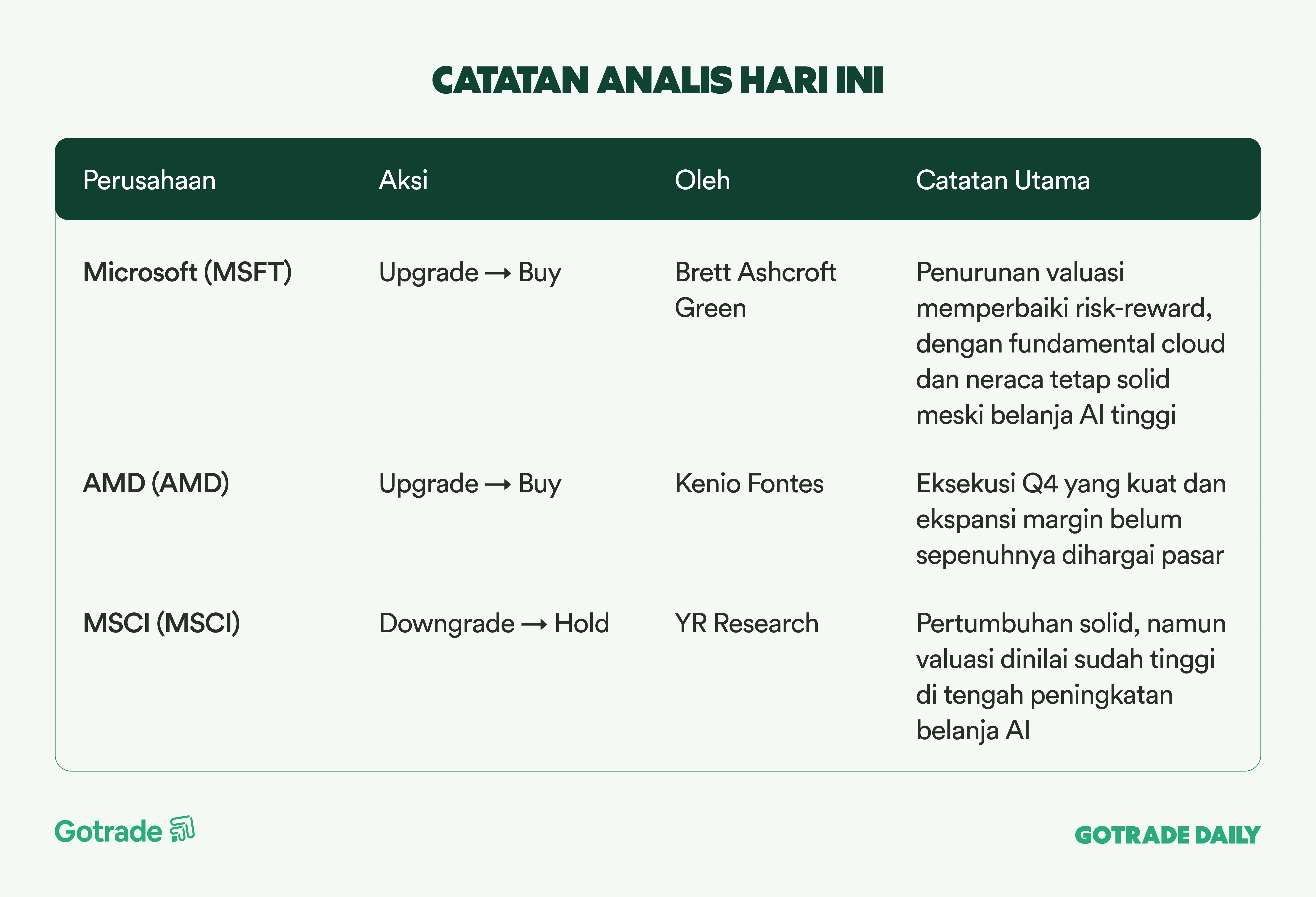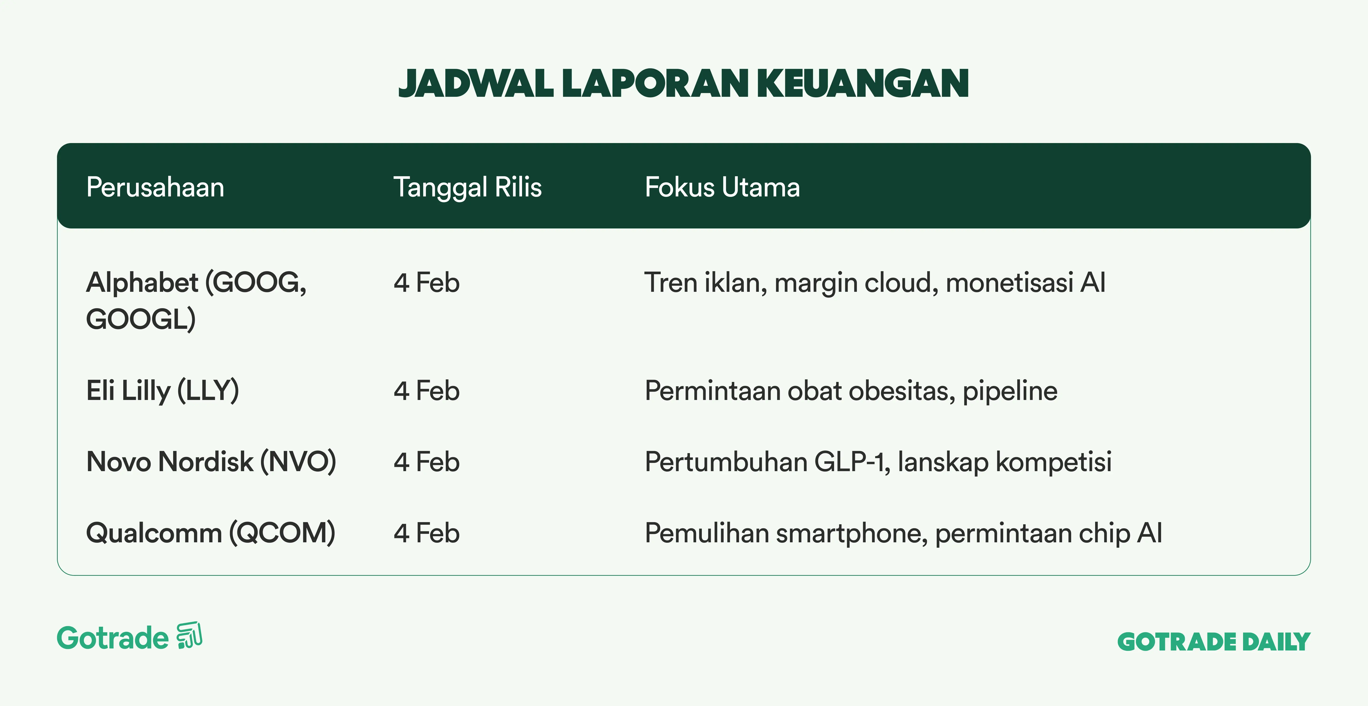 Dengan lebih dari 100 perusahaan S&P 500 dijadwalkan merilis laporan keuangan pekan ini, fokus investor mulai bergeser dari perdagangan berbasis momentum ke kualitas fundamental, arah panduan manajemen, dan kekuatan neraca, terutama untuk emiten besar seperti Alphabet (GOOG, GOOGL) dan Amazon (AMZN) yang akan melaporkan kinerja dalam beberapa hari ke depan.