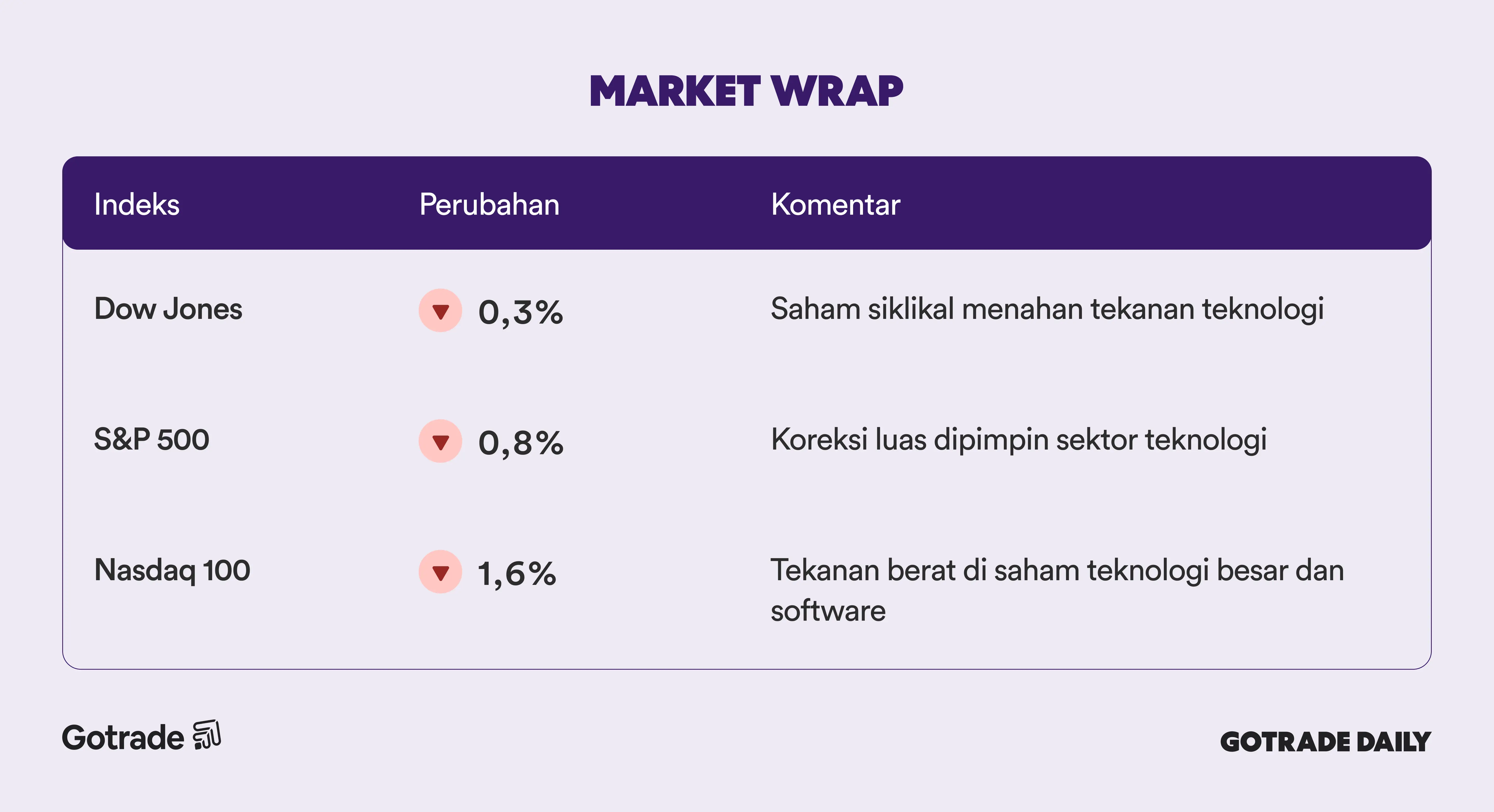 Pasar saham AS terkoreksi seiring investor melakukan rotasi keluar dari saham teknologi, menekan indeks utama meski beberapa sektor lain menunjukkan ketahanan. S&P 500 turun 0,84%, sementara Nasdaq Composite melemah 1,43%, dipimpin penurunan saham teknologi besar seperti Microsoft (MSFT), Meta Platforms (META), Nvidia (NVDA), dan Apple (AAPL). Dow Jones Industrial Average turun 0,34%, meski sempat menyentuh rekor intraday baru di awal sesi.