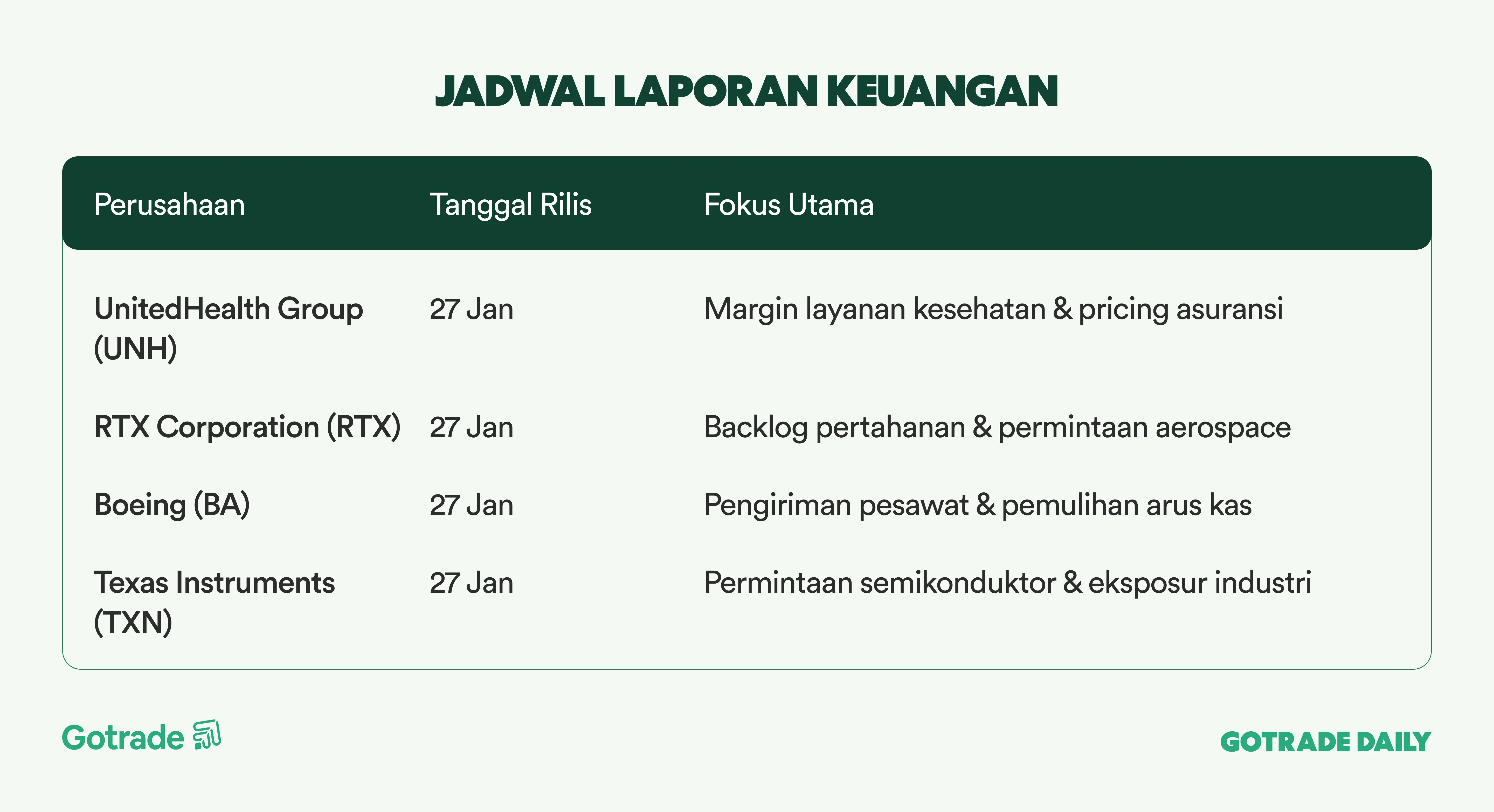 Di luar Big Tech, pasar juga mencermati sinyal siklus ekonomi dari emiten besar seperti Caterpillar (CAT), Boeing (BA), General Motors (GM), Visa (V), Mastercard (MA), Exxon (XOM), dan Chevron (CVX). Earnings dari sektor-sektor ini memberi gambaran tentang kesehatan manufaktur, permintaan industri, aktivitas konsumen, dan dinamika energi global, melengkapi narasi pasar di luar AI.