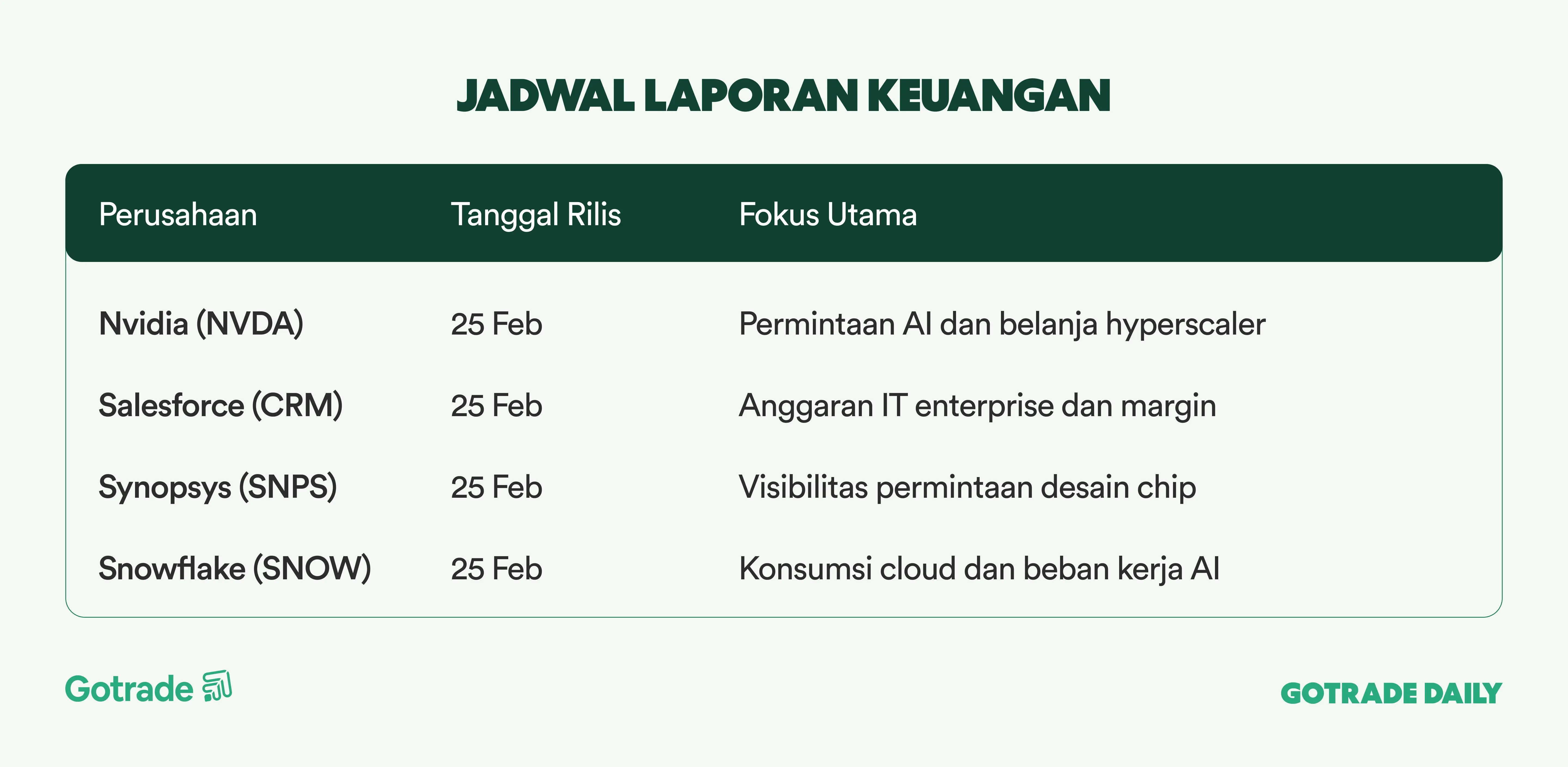 Fokus pasar kini sepenuhnya beralih ke laporan Nvidia, yang dalam beberapa tahun terakhir menjadi katalis utama pergerakan saham teknologi dan tema AI global.