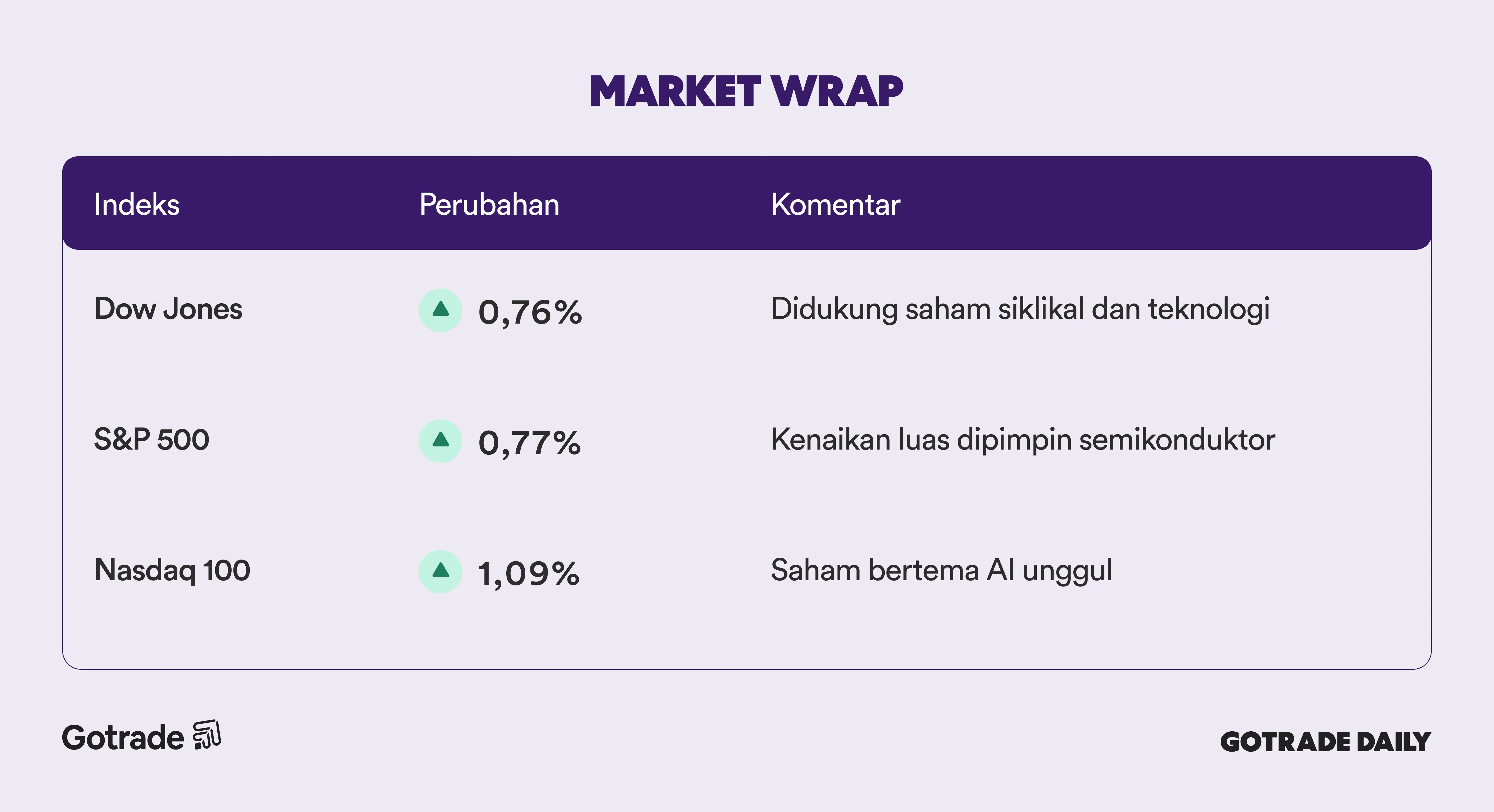 Saham AS menguat pada Selasa, dipimpin sektor teknologi dan semikonduktor, seiring meredanya kekhawatiran bahwa kecerdasan buatan akan langsung mengganggu model bisnis perusahaan perangkat lunak. S&P 500 naik 0,77%, Nasdaq Composite menguat 1,04%, dan Dow Jones bertambah 0,76%, didorong penguatan saham chip dan enterprise software.