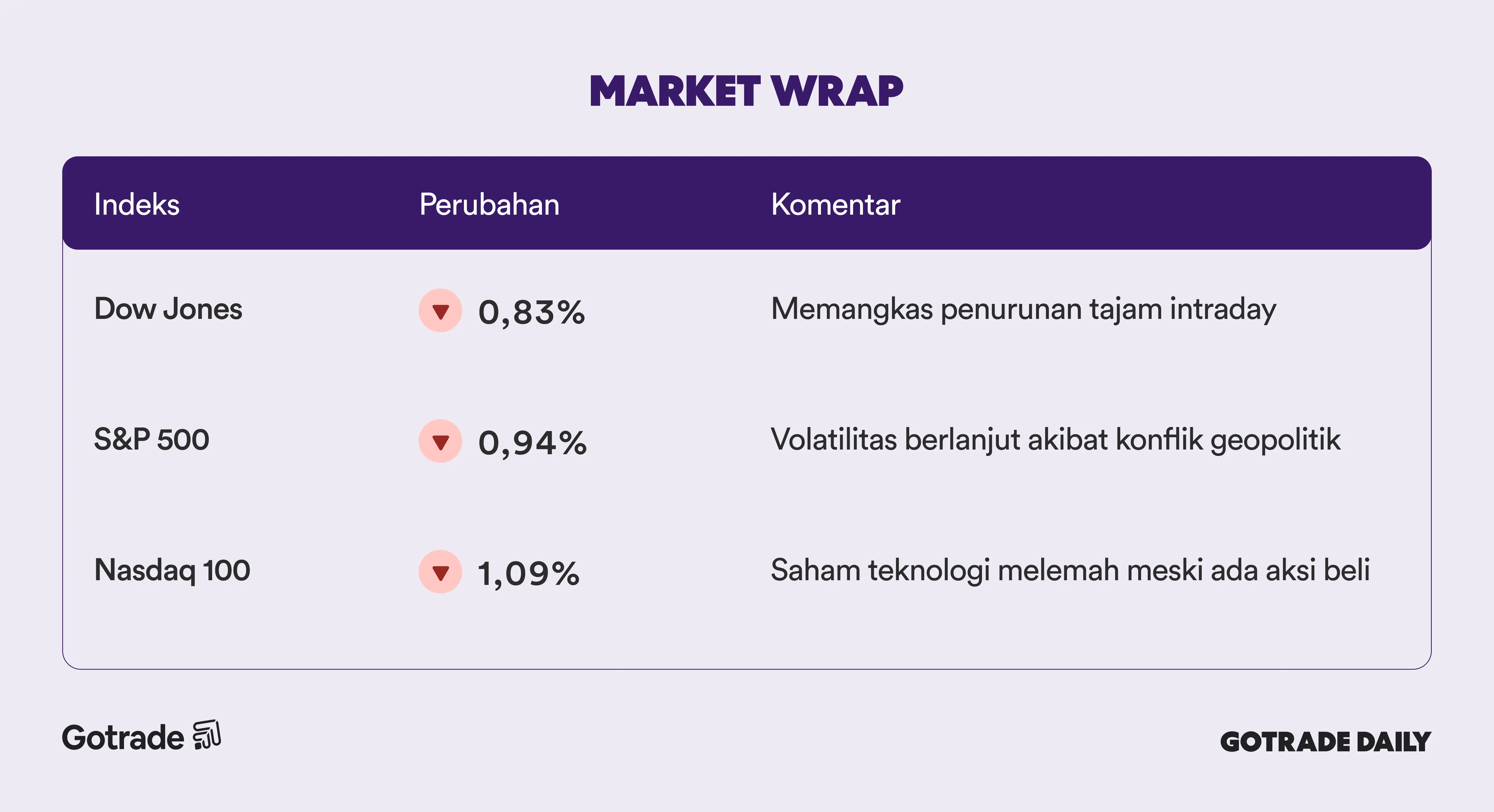 Saham AS ditutup melemah pada Selasa seiring volatilitas pasar yang masih tinggi akibat eskalasi konflik di Timur Tengah, meski indeks utama berhasil memangkas penurunan tajam di awal sesi. Dow Jones Industrial Average, S&P 500, dan Nasdaq 100 masing-masing turun sekitar 0,8%, 0,9%, dan 1,1% setelah sempat jatuh jauh lebih dalam sebelumnya.