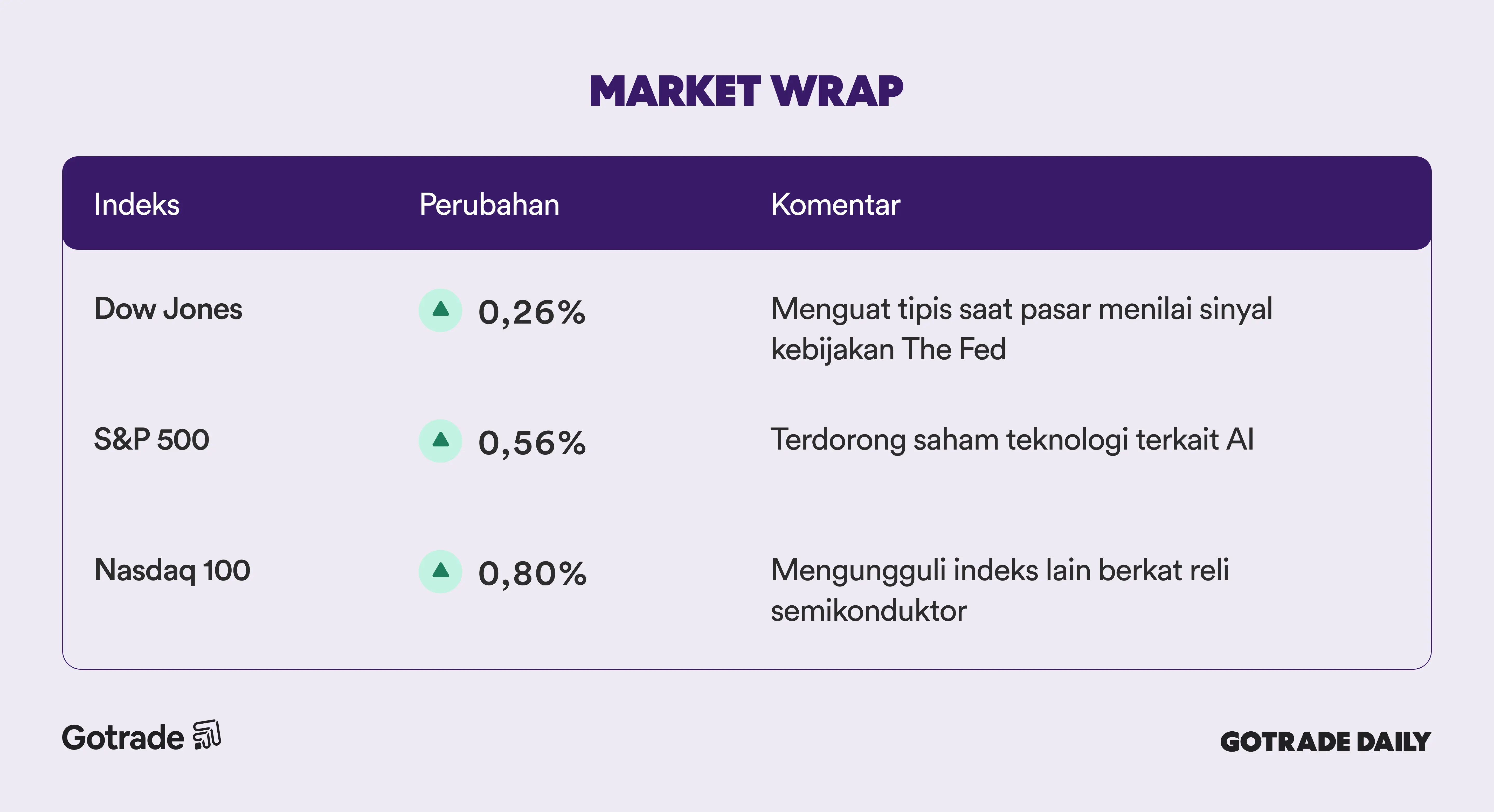 Saham AS ditutup menguat pada Rabu, ditopang reli sektor teknologi ketika investor mencerna risalah rapat terbaru Federal Reserve. S&P 500 naik 0.56%, Nasdaq bertambah 0.78%, dan Dow Jones menguat 0.26%, mencerminkan optimisme hati-hati di tengah ketidakpastian arah suku bunga.