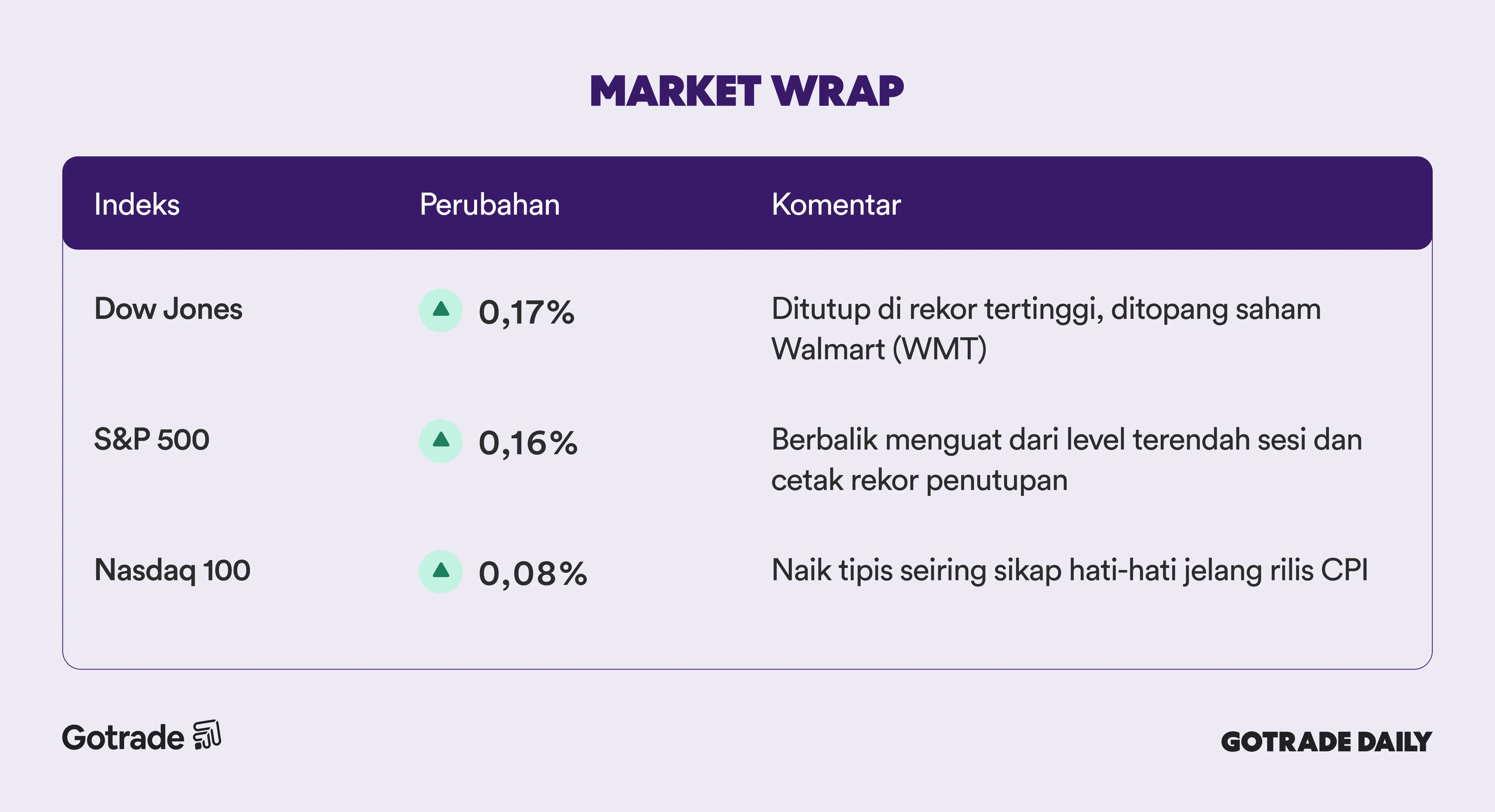 Penguatan Dow didorong oleh saham konsumer dan beberapa saham teknologi, termasuk Walmart (WMT). Partisipasi pasar yang lebih luas juga terlihat, dengan Russell 2000 mencetak rekor tertinggi baru.