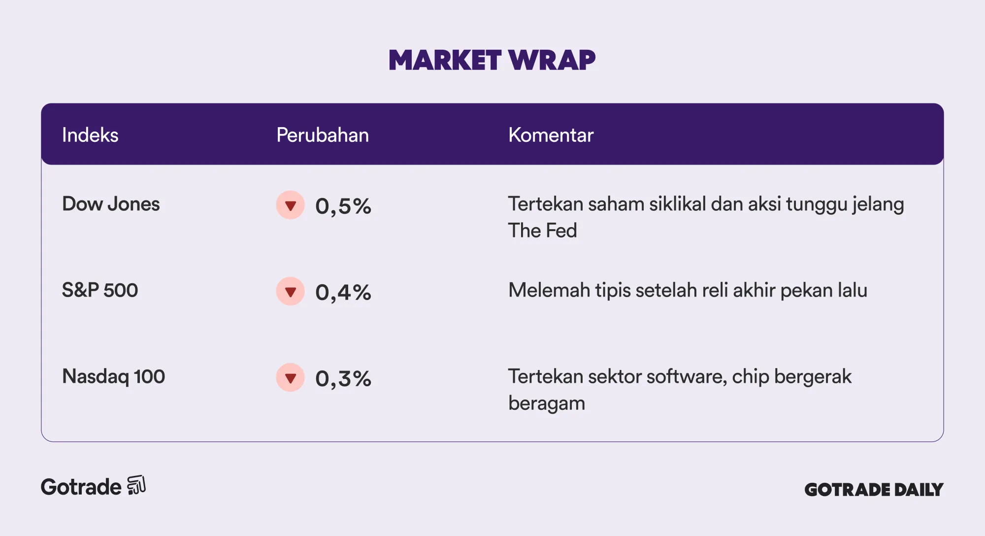 Bagi trader, kondisi ini menunjukkan dua fokus utama pasar: risiko kebijakan menjelang keputusan Rabu dan perubahan kepemimpinan sektor teknologi akibat sentimen geopolitik di industri semikonduktor. Di sisi korporasi, saham Warner Bros. Discovery (WBD) melonjak setelah munculnya tawaran akuisisi baru, sementara Netflix (NFLX) turun lebih dari 3 persen.