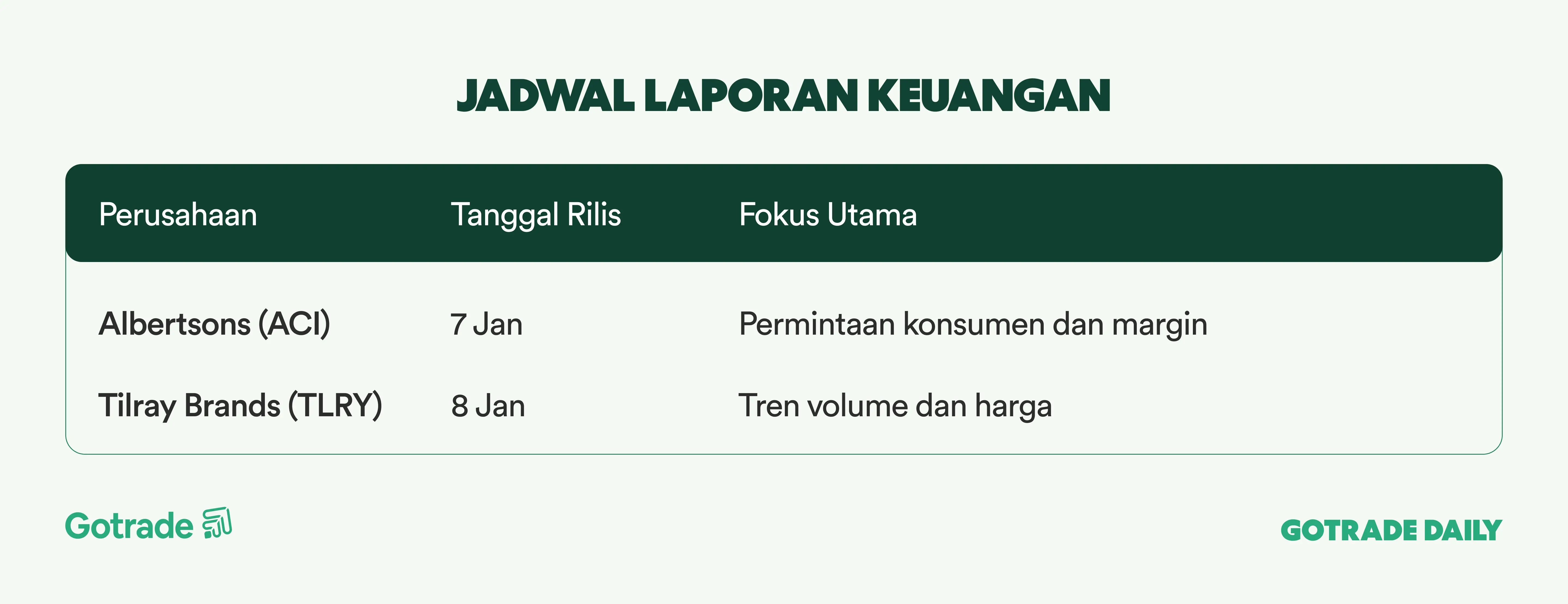 Di luar energi, pergerakan lintas aset mencerminkan peningkatan sensitivitas terhadap risiko geopolitik. Harga emas dan perak melonjak sebagai aset lindung nilai, imbal hasil obligasi pemerintah AS turun, dan Bitcoin memantul dari level terendah akhir pekan. Sementara itu, saham AI seperti Nvidia (NVDA) dan Advanced Micro Devices (AMD) tertinggal karena investor menunggu sinyal baru dari CES 2026, menandakan rotasi sementara dari growth ke komoditas dan siklikal.