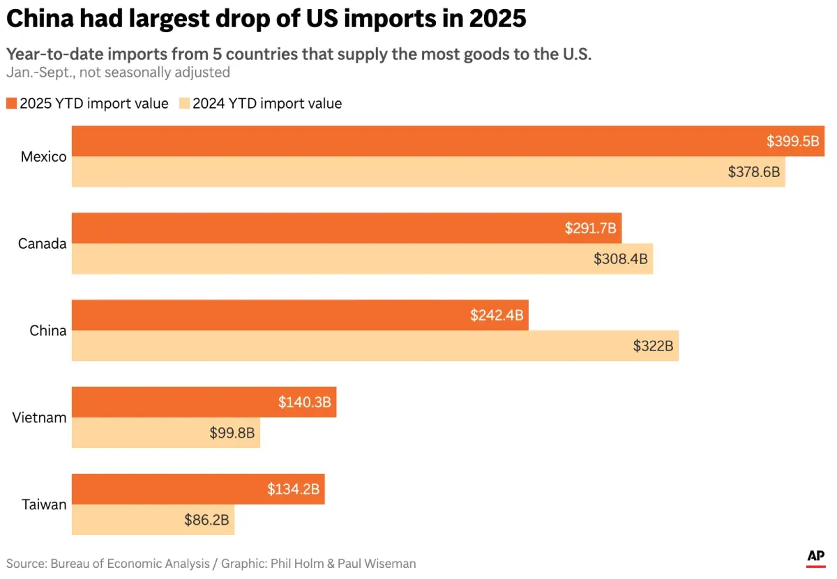 - Impor dari China anjlok 25 persen, sementara Meksiko dan Vietnam mengambil alih pangsa pasar.