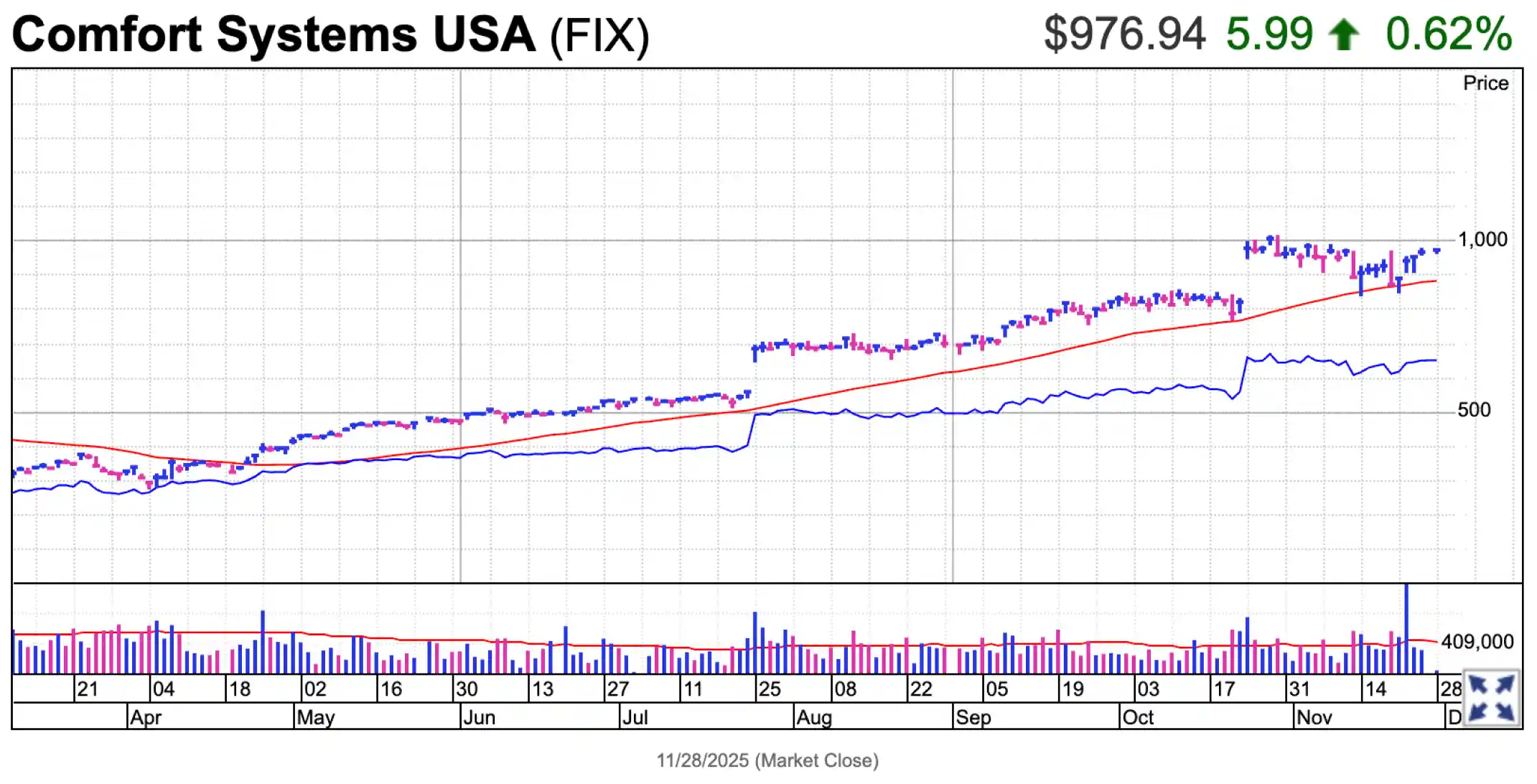Saham Comfort Systems (FIX) sedang membentuk basis baru dan membutuhkan waktu sekitar satu minggu lagi untuk matang. Titik beli potensial berada di level 1020,26.