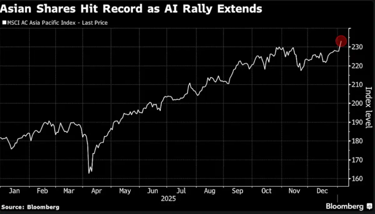 - Indeks saham Asia mencapai rekor tertinggi baru berkat reli saham teknologi dan semikonduktor.